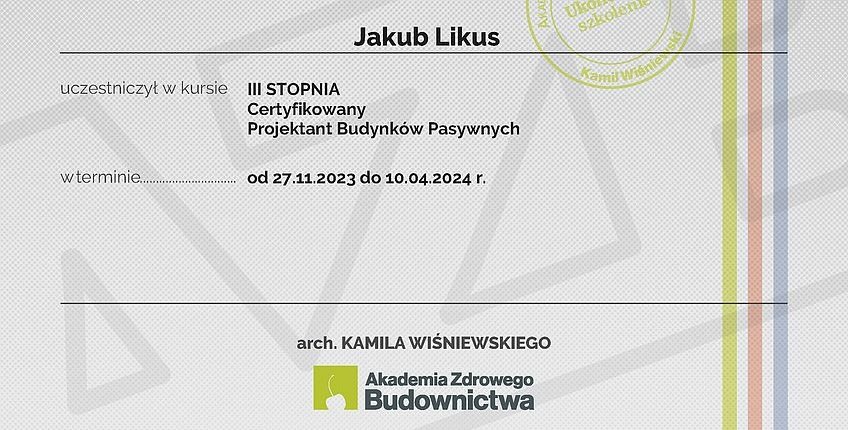 Jakub Likus w kwietniu 2024 r. ukończył kurs Certyfikowanego Projektanta Budynków Pasywnych — organizowany jest przez Polski Instytut Budownictwa Pasywnego wg wymagań Passivhaus Institut Darmstadt.